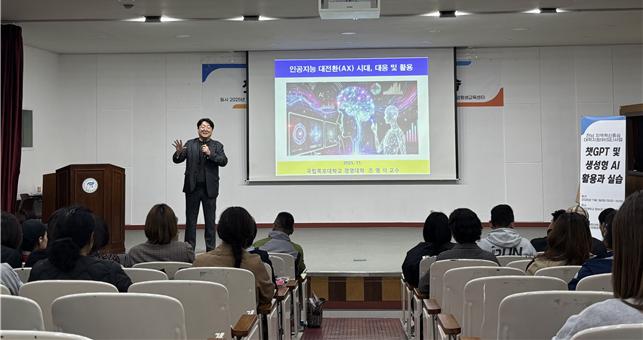 사진설명: 국립목포대학교 조영석 교수가 세한대학교 전남RISE사업단 취창업평생교육센터 주관 「제2회 경력개발 및 취업역량 강화 특강」에서 ‘챗GPT 및 생성형 AI 활용과 실습’을 주제로 강연을 진행하고 있는 모습. 참가자들이 실습자료를 보며 AI 기술의 최신 동향과 활용 방안을 경청하고 있다.