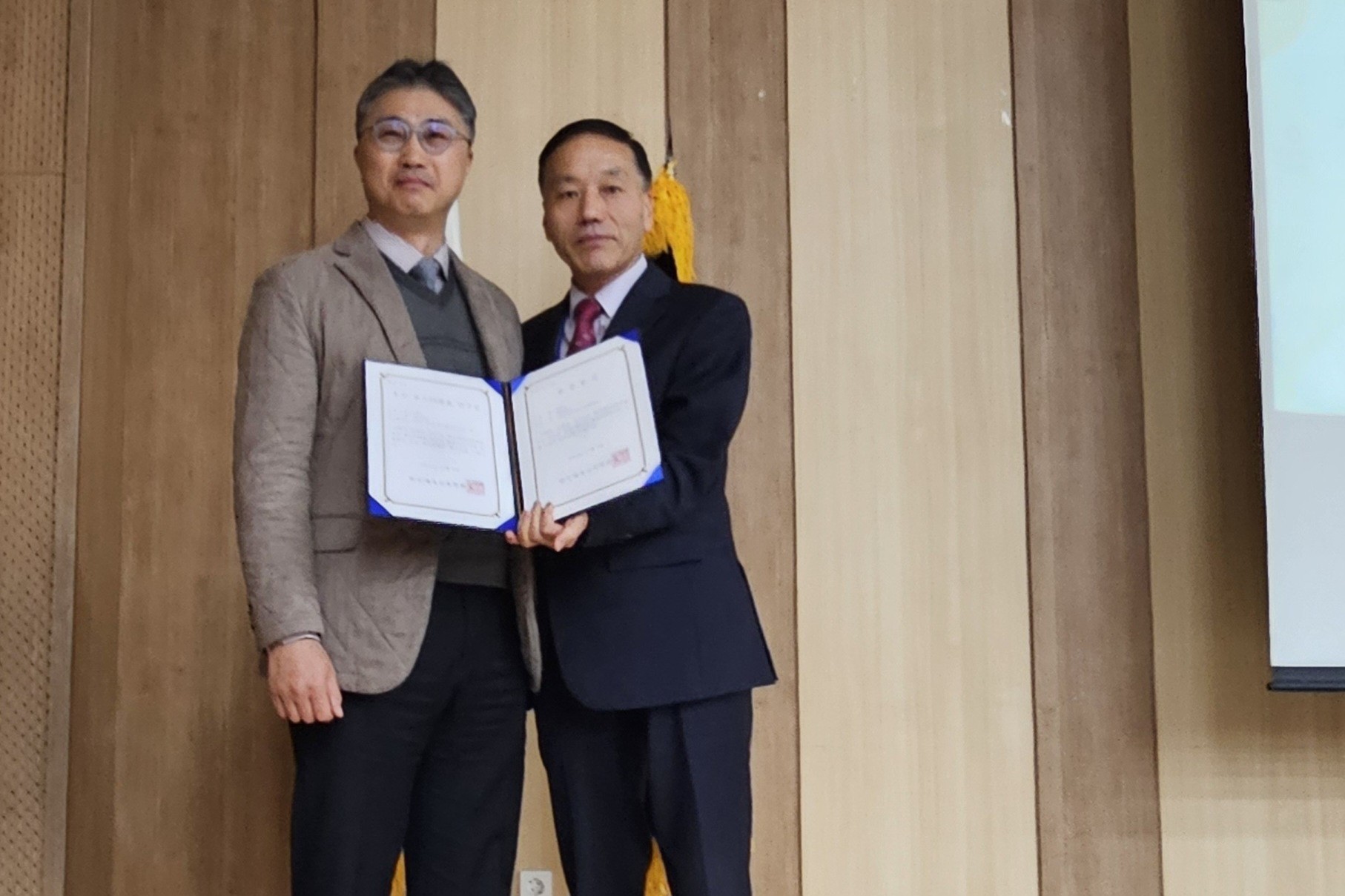 <세한대학교 태권도공공안전학과 정현도 교수가 우수 포스터 발표 연구상을 수상하고 옥광 회장과 기념 촬영을 하고 있는 모습>