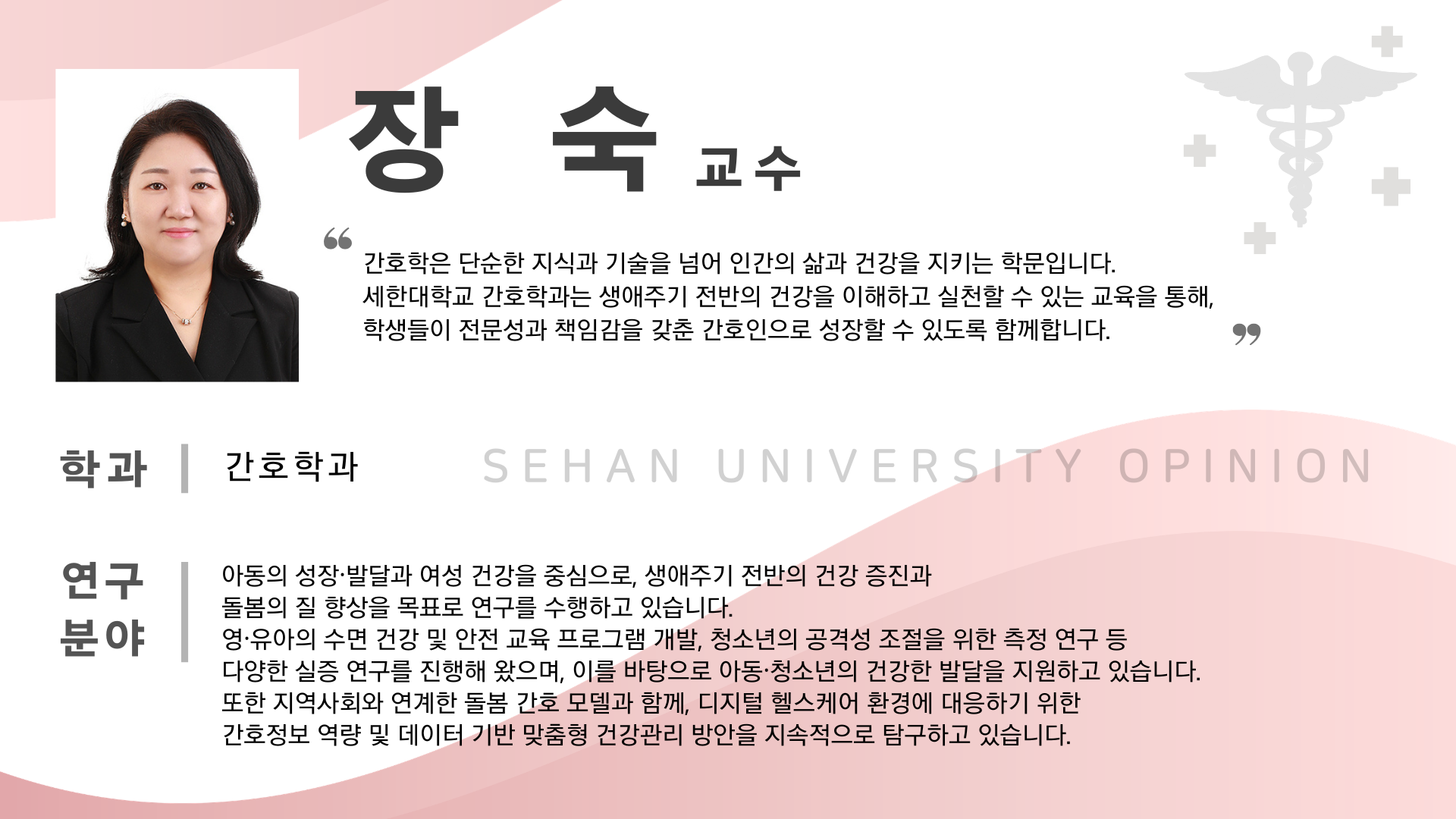 '간호학은 단순한 지식과 기술을 넘어 인간의 삶과 건강을 지키는 학문입니다', 간호학과 장 숙 교수